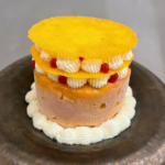 Cut the almond cake using a ring cutter to match the size of the semifreddo. Place the cake base in a bowl and top with the semifreddo. Pipe Crème Fraîche Mousse around the perimeter of the semifreddo in dots, alternating with smaller dots of Red Jalapeño Gel. Place a guava tuile on top of the dots and repeat another layer. Pipe a small circle of mousse in the center and top with a second tuile. Pipe a shell pattern of mousse around the sides of the almond cake to finish.